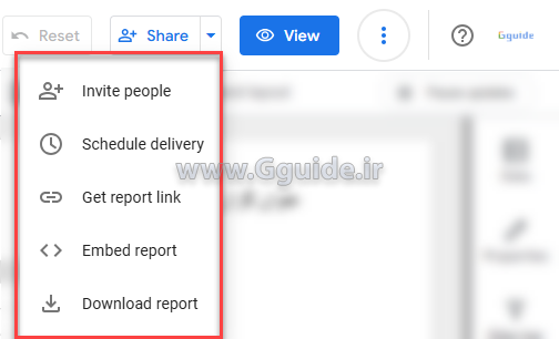 برای به اشتراک گذاشتن یک گزارش طراحی شده در لوکر استودیو (Looker Studio)، در نوار ابزار بالای صفحه، بر روی گزینه Share کلیک میکنیم، این گزینه دارای حالتهای زیر است؛