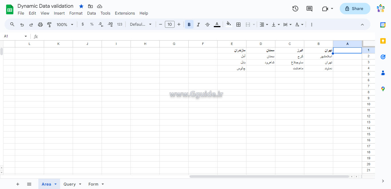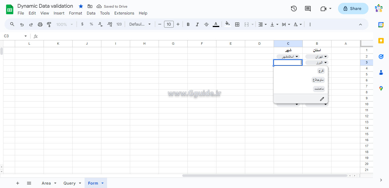بسیاری از مواقع برای کنترل ورود دادهها توسط کاربر در گوگل شیت، از لیستهای کشویی که توسط Data validation ایجاد میشود استفاده میکنیم. گاهی نیاز داریم که مقادیر یک لیست کشویی براساس یک مقدار دیگر تعریف شود، مثلا پس از انتخاب نام استان، شهرهای مرتبط با آن استان نمایش داده شود، در این حالت نیازمند استفاده از لیست کشویی وابسته (Dynamic Data validation) هستیم.