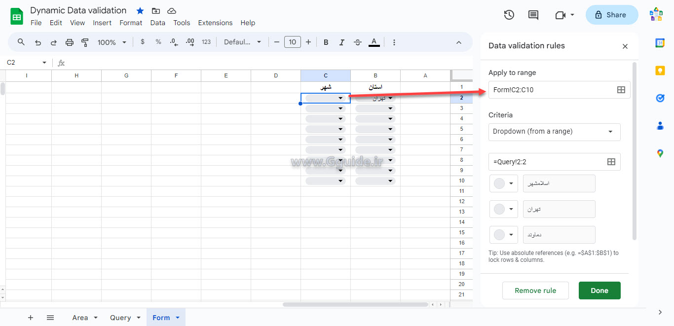 حالا یک شیت کمکی ایجاد میکنیم (مثلا با نام Query)، در شیت Query فرمول زیر را تعریف میکنیم (و در ردیفهای پائین تعمیم میدهیم) تا شهرهای متناظر هر استان که در شیت Form تعریف شده، نمایش داده شود؛