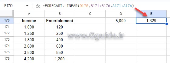 فرض کنید جدولی از درآمد (Income) و میزان هزینههای تفریحات و سرگرمی (Entertainment) یک خانواده طی سالهای گذشته را داریم، با استفاده از تابع FORECAST میتوانیم میزان هزینههای تفریحات و سرگرمی این خانواده را براساس درآمد احتمالی آنها در سال آینده مطابق تصویر زیر محاسبه کنیم؛