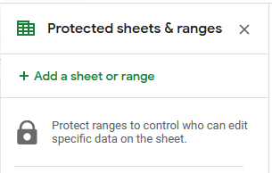 با استفاده از این گزینه میتوان دسترسی کاربران را به تمام یا قسمتی از شیتهای یک فایل گوگل شیت محدود کرد، پس از کلیک بر روی گزینه Protected sheets and ranges یک پنجره به صورت زیر در سمت راست صفحه نمایش داده میشود؛
