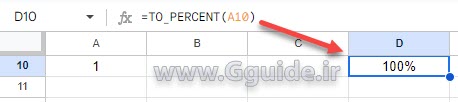 در گوگل شیت تابع دیگری با نام UNARY_PERCENT وجود دارد که عملکرد آن مشابه تابع TO_PERCENT است با این تفاوت که تابع UNARY_PERCENT یک مقدار عددی را تقسیم بر 100 نموده و بدون علامت درصد (%) نمایش می دهد.