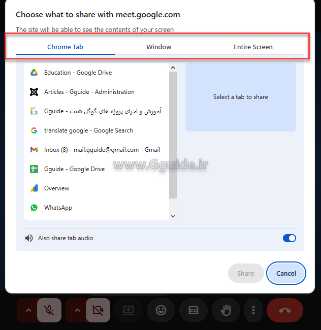 - پرزنت (ارائه) کرن در محیط گوگل میت، با کلیک بر روی این گزینه پنجره زیر باز میشود؛
